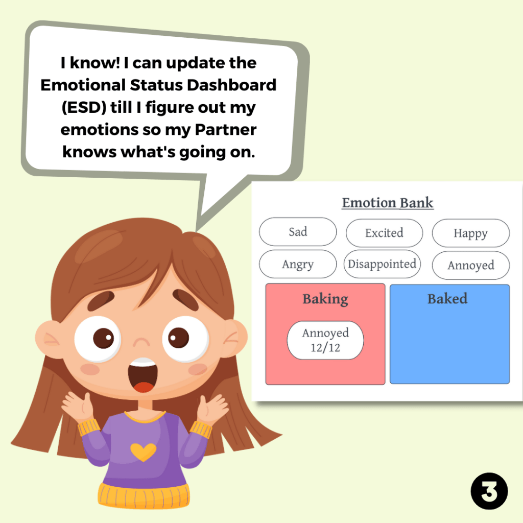 - The ESD clarifies who has responsibility for what part of the process. The Partner who invokes the ESD has the responsibility to label the emotions and manage themselves to work through what they are feeling; once they are in a healthy space – and ready for a conversation, move the emotions to the baked column, and if you feel like it brings up the conversation. The other partner is holding the space, managing their expectations and emotions and when they see that the emotions are in the baked column creating a Safer Space for the two to have an honest conversation and share what happened and what was felt.