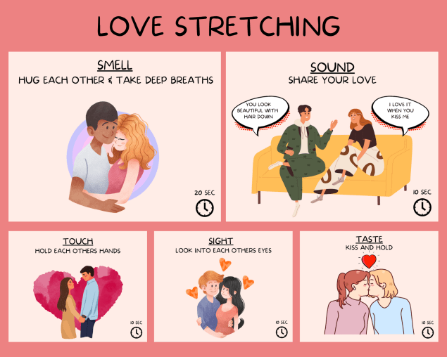 Unlike physical stretching, this requires more than just moving your limbs. The idea behind love stretching is to activate all your senses. Try this 5 step Love Stretching exercise